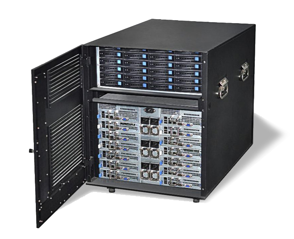 Ebpay(中国)融合一体机就是解决环境使用问题而推出的综合性计算产品,它不需要专业的机房设施,不需要专业的配电和空调设备,放在办公室或实验室接墙电就可使用, 具有低噪音、低功耗等特点。最高可以安装14个双路XEON E5 处理器的刀片服务器,48个外置热插拔硬盘存储,内置一个万兆网络交换机安装空间,带有整体状态显示和控制系统,内部散热和防尘处理。专为办公室应用环境 设计,它在众多方面超越了传统机架式服务器、刀片服务器和机群服务器,是高稳定、高性能、低环境要求的新一代桌边型高性能计算机。它采用整体优化的设计, 有效降低了系统功耗,再加上其人性化的设计、很强的系统扩展能力、卓越的性价比和计算密度,可以覆盖更广泛的个人及工作组用户对高性能计算的需求,与传统 的高性能计算机相比,Ebpay(中国)融合一体机可给予更有竞争力的整体解决方案,是更好满足中小高性能计算需求的理想平台。下图为14个刀片打开效果图: